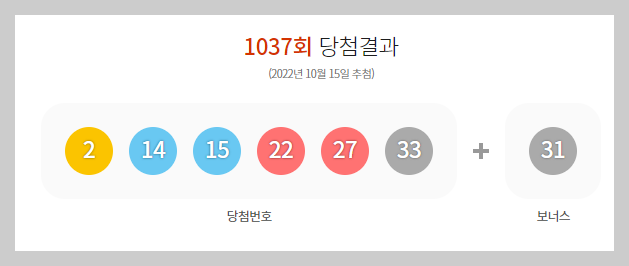 2022년 10월 15일 로또 당첨결과 1등 당첨번호는 2, 14,15,22,27,33 번이 당첨번호로 나왔습니다. 1인당 당첨금은 1,708,576,825원 입니다. 40번대 당첨번호는 없고 10번대와 20번대가 2개 그리고 연속번호는 14번, 15번이 나왔습니다.